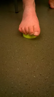 2. Tämä on minulle jo kovin tutun isovarpaan tyvinivelen uusi liike. Liike tehdään istuen, ja tyviniveltä painetaan kohti lattiaa tennispallon puolikkaan päällä niin, että pallo painuu hiukan kasaan. Jokainen painallus kestää kymmenen sekuntia ja niitä tehdään kymmenen kertaa. Vekkulin apuvälineen, tennispallon puolikkaan, sain mukaani kotiin.